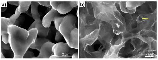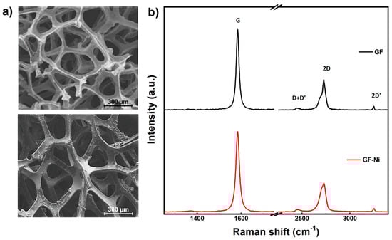 It is worth mentioning that the PMMA support layer used in the process of etching away the metallic substrate is a prerequisite only for thin graphene layers. When the graphene layers are increased above five, the metallic skeleton can be etched in the absence of a PMMA support layer []. As revealed in Figure 8a, even though the etching was carried out in the absence of the supporting PMMA polymer, the GF maintained its integrity after scaffold removal. A different behavior was observed when the thickness of the graphene foam was ~3 graphene layers []. In this case, the role of PMMA is to prevent the graphene network from collapsing.