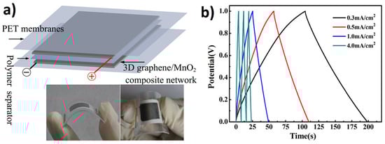 (a) Schematic of the flexible supercapacitors consisting of two symmetrical graphene/MnO2 composite electrodes, a polymer separator, and two PET membranes. The two digital photographs show the flexible supercapacitors when bent; (b) Galvanostatic charging/discharging curves of the flexible supercapacitor device at different current densities. Reprinted with permission from ref. []. Copyright 2012 American Chemical Society.