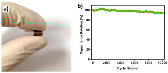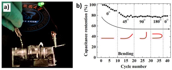 (a) A demonstration of six FSCs connected in series lighting a green LED bulb; (b) Capacitance retention of the FSC based on MnO2/MGF/NF with a loading time of 12 h, with a dynamic bending process. Reprinted from ref. [] with permission from Elsevier B.V.