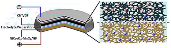 In 2017, Liu [] developed a 3D foam-like MnO2 film/multilayer graphene film/Ni foam (MnO2/MGF/NF) for flexible supercapacitors (Figure 10).