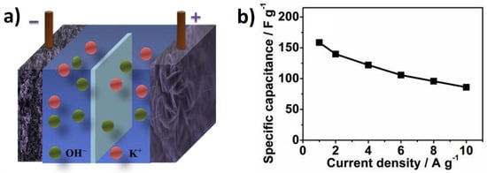 Liu and collaborators [] developed Ni(OH)2/G-NF/Ni(OH)2 as the electrode in a supercapacitor, which showed an specific capacity of 991 Cg−1 at a current density of 1 Ag−1, good rate capability of 70.7% at 20 Ag−1, and with a retaining capacity of 95.4% after 5000 cycles.