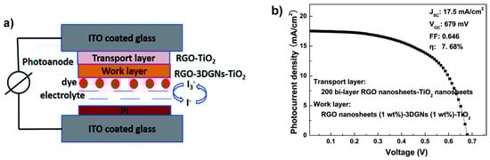 - Tang, B.; Ji, G.; Wang, Z.; Chen, H.; Li, X.; Yu, H.; Li, S.; Liu, H. Three-dimensional graphene networks and reduced graphene oxide nanosheets co-modified dye-sensitized solar cells. RSC Adv. 2017, 7, 45280–45286. [Google Scholar] [CrossRef] [Green Version]