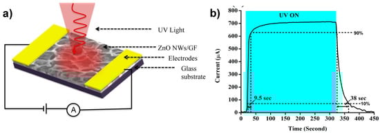 - Boruah, B.D.; Mukherjee, A.; Sridhar, S.; Misra, A. Highly dense ZnO nanowires grown on graphene foam for UV photodetection. ACS Appl. Mater. Interfaces 2015, 7, 10606–10611. [Google Scholar] [CrossRef] [PubMed]