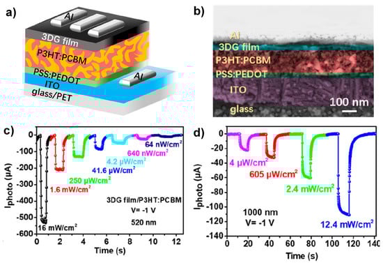 - Ge, Z.; Xu, N.; Zhu, Y.; Zhao, K.; Ma, Y.; Li, G.; Chen, Y. Visible to Mid-Infrared photodetection based on flexible 3D graphene/organic hybrid photodetector with ultrahigh responsivity at ambient conditions. ACS Photonics 2022, 9, 59–67. [Google Scholar] [CrossRef]