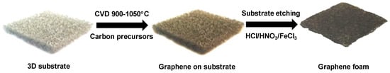 Graphene, a two-dimensional single sheet of sp2 carbon atoms arranged in a hexagonal lattice, continues to draw extensive attention because of its peculiar properties. The theoretical specific surface area (SSA) of graphene is estimated to be about 2630 m2·g−1. Nevertheless, graphene tends to restack and form irreversible aggregates, which leads to a significant decrease in the surface area. To this end, different strategies for assembling 2D graphene in 3D architectures have been investigated, to preserve the large surface area of graphene [,,]. A significant breakthrough occurred in 2011, when Chen reported an innovative approach to synthesizing template-assisted 3D graphene networks. The free-standing 3D graphene networks or graphene foams (GF) obtained by etching the metallic template were light and flexible, with an ultralow density of ~5 mg·cm−3, corresponding to the high porosity of ~99.7%; and a very high specific surface area, up to ~850 m2·g−1, corresponding to an average number of layers of ~3 []. The mechanical stability of the free-standing graphene enabled subsequent deposition of nickel oxide [] or other inorganic/organic materials, to expand their functionality. Besides the larger surface area and high electrical conductivity, the elastic stretchability of GF is ~95% [], which is much larger than the native stretchability of single-layer graphene (SLG ~6%) [].