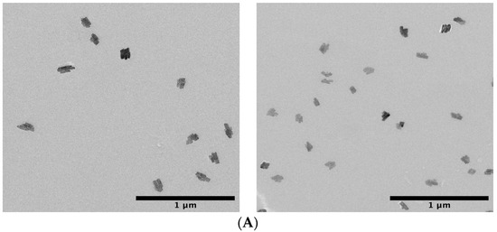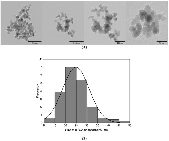 Figure 4A presents the Transmission Electron Microscopy (TEM) analysis of the n-BGs obtained by the sol–gel method with an average particle size of ca. 24.87 ± 6.26 nm. The shape of the nanoparticles was primarily spherical. However, it can also be seen that there were agglomerations of nanoparticles, something expected in this type of methodology preparation of n-BGs [28]. To determine the particle size, the diameter of 100 nanoparticles was taken using the Image J program, with which the size distribution histogram of Figure 4B was constructed.