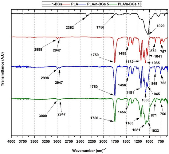 Figure 5 shows the IR spectrum corresponding to the n-BGs/PLA scaffolds. All samples exhibited molecular vibrations for the different functional groups in the IR for PLA and the n-BGs.