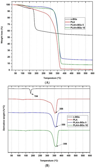 TGA and DTGA analysis of the nanocomposites of (A) neat PLA, PLA/n-BGs 5 wt.%, and PLA/n-BGs 10 wt.%. (B) Derivative TGA of neat PLA, PLA/n-BGs 5 wt.%, and PLA/n-BGs 10 wt.%.
