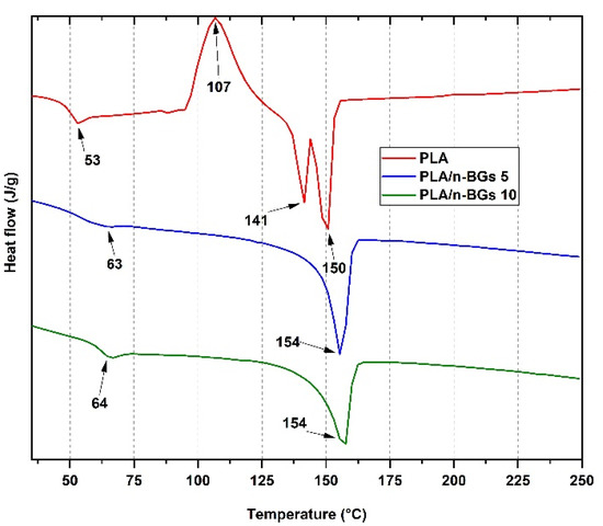 DSC thermograms for the neat PLA nanocomposites, PLA/n-BGs 5 wt.%, and PLA/n-BGs 10 wt.%.