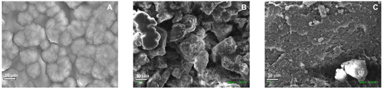Electron micrographs of (A) neat PLA, (B) PLA/n-BGs 5 wt.%, and (C) PLA/n-BGs 10 wt.% at 1000×.