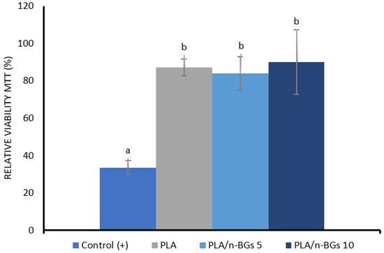 PLA has wide applications in tissue engineering due to its recognized biocompatibility [47,48]. n-BGs are also materials widely used in bone tissue engineering due to their biocompatibility and the ability to attract osteogenic cells as they are resorbed when implanted in bone tissue [49]. In addition, their ability to stimulate bone healing has been demonstrated due to their ability to join the bone by depositing a layer of hydroxyapatite on their surface, stimulating cell differentiation [50] and proangiogenic properties [51].