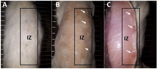 Macroscopic image of a biomodel implanted at 30 days. (A). Dorsal image. (B) Dorsal image with a trichotomy. (C) Inner surface of the skin. IZ: Implantation zone. White arrows: Implantation sites.