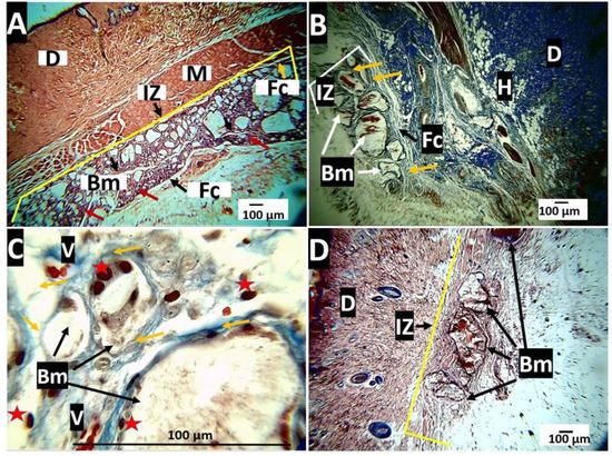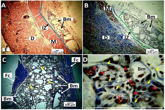 Neat PLA implanted at 30, 60, and 90 days. (A): 30 days, Hematoxylin-Eosin technique, 4×. (B): 60 days, Masson’s Trichrome technique, 4×. (C): 90 days, Masson’s Trichrome technique, 10×. (D): 30 days, Masson’s Trichrome technique, 100×. E: epidermis. D: dermis. M: muscle. IZ: implantation zone. Bm: biomaterial. Fc: fibrous capsule. Yellow arrows: collagen I fiber. V: blood vessel. Red star: inflammatory cells.