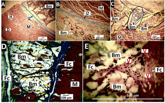 Nanocomposites PLA/n-BGs 5 wt.% implanted at 30, 60, and 90 days. (A): 30 days, Hematoxylin-Eosin technique, 4×. (B): 60 days, Masson’s Trichrome technique, 4×. (C): 90 days, Masson’s Trichrome technique 10×. Black oval: particles of biomaterial in the process of fragmentation. Yellow oval: biomaterial particles with surface changes in the process of degradation. (D): 60 days, Masson’s Trichrome technique, 10×. (E): 60 days, Hematoxylin Eosin technique 100×. D: dermis. H: hypodermis. M: muscle. IZ: implantation zone. Bm: biomaterial. Fc: fibrous capsule. Red arrows: particles of the material in the process of degradation/reabsorption. Yellow arrows: collagen I fiber. V: blood vessel.