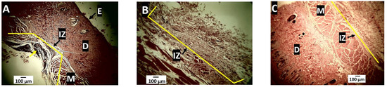 After 30 days of implantation, a significant presence of material samples was observed (Figure 14A), while at 60 days, it was observed that the material was fragmented. The particles started a reabsorption process with the presence of surrounding inflammatory cells (red arrows, Figure 14B). At 90 days (Figure 14C), some small-sized particles with an appearance observed in the 60 days (black oval) were observed. However, there were also groups of particles with a different appearance, which seemed to be in the degradation process (yellow ovals).