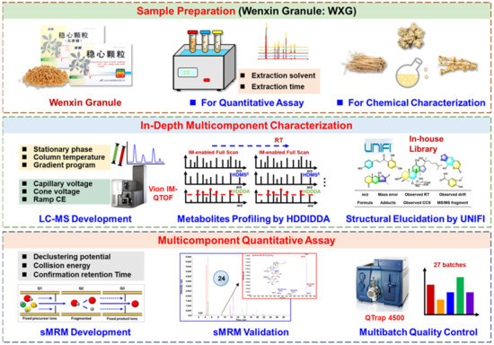 Quality evaluation of Wenxin granule (WXG) via UHPLC/IM-QTOF-MS-based multicomponent characterization and quantitative assay using scheduled MRM facilitated by UHPLC/QTrap-MS.