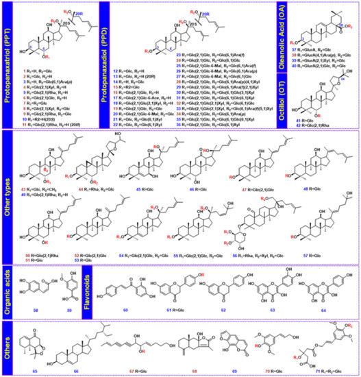 - Li, X.; Liu, J.; Zuo, T.T.; Hu, Y.; Li, Z.; Wang, H.D.; Xu, X.Y.; Yang, W.Z.; Guo, D.A. Advances and challenges in ginseng research from 2011 to 2020: The phytochemistry, quality control, metabolism, and biosynthesis. Nat. Prod. Rep. 2022, 39, 875–909. [Google Scholar] [CrossRef]