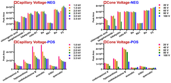 The ion source parameters (capillary voltage and cone voltage) determine the overall ion response, while the collision energy applied in the collision cell (ramp collision energy (RCE) for HDMSE; mass-dependent RCE (MDRCE) for HDDDA) affects the generation of fragments that are useful for the structural elucidation process. In this work, these parameters were optimized using a mass spectrometer operating in both negative and positive ESI modes. Given the component diversity of WXG, eight representative components, including ginsenosides Re, -Rb1, -Ro, -F2, notoginsenoside R1 (noto-R1), chlorogenic acid, tangshenoside, and lobetyolin, were selected for the index in the negative mode (ESI−), while codonopsinol A, hypoxanthine, codotubulosine B, acacetin, trillin, and quercetin were considered in positive mode (ESI+). For ESI−, the variation tendencies of the ion responses for these components among the different capillary voltage (1.0–3.5 kV) and cone voltage (20–100 V) settings are shown by the histograms in Figure 4. By comparing the peak areas in the extracted ion chromatogram (EIC), it was found that with the increase in capillary voltage, the responses of chlorogenic acid, tangshenoside I, Ro, and noto-R1 basically decreased, while the other components (lobetyolin, Re, Rb1, and F2) first became more abundant and then weaker. Therefore, the capillary voltage at 1.5 kV in negative mode was selected. Due to the ion responses of the six indicators decreasing with the increase in capillary voltage, 1 kV was chosen in positive ion mode. Five groups of cone voltages were optimized in both positive and negative ion modes: 20 V, 40 V, 60 V, 80 V, and 100 V. The results indicated that when the cone voltage exceeded 60 V, the peak area values of chlorogenic acid, tangshenoside I, lobetyolin, noto-R1, Re, and Ro showed a decreasing trend in negative mode, while the peak areas of Rb1 and F2 increased. The results also proved that in positive ion mode, when the cone voltage was 20 V, the peak areas of the four components were the largest (expect for quercetin and acacetin). Consequently, the cone voltage was set to 60 V in negative ion mode and 20 V in positive ion mode. The Vion IM-QTOF hybrid high-resolution mass spectrometer can enable the RCE in HDMSE and the MDRCE in HDDDA. For RCE in HDMSE, in the negative ion mode, three energy groups at 10–50, 20–60, and 30–70 eV were compared, and 20–60 eV was selected by considering the richness of the MS2 fragments of ginsenosides, flavonoids, organic acids, and the phenylpropanoid. The four energy groups at 10–40, 20–50, 30–60, and 15–40 eV were compared in positive ion mode, and 15–40 eV was selected by considering the abundance of the secondary fragments of ginsenosides, alkaloids, steroidal saponins, and the other components. Differing from the RCE, the MDRCE in DDA mode can enable a targeted collision energy ramp on the precursors through the predefined scan range. According to the same selection rules as used for comparing the RCE in HDMSE, four energy groups (10–30/40–60, 20–40/50–70, 30–50/70–90, and 15–30/30–40 eV) in negative ion mode and five energy groups (10–20/20–30, 20–30/30–40, 30–40/40–50, 40–50/50–60, 15–20/20–35 eV) in positive mode were compared for MDRCE values in HDDDA. We finally selected MDRCE values of 15–30/30–40 eV in the negative ion mode and 15–20/20–35 eV in the positive ion mode to obtain the diversified product ions for most of the compounds. Detailed information is displayed in Figures S3 and S4, Supplementary Materials.