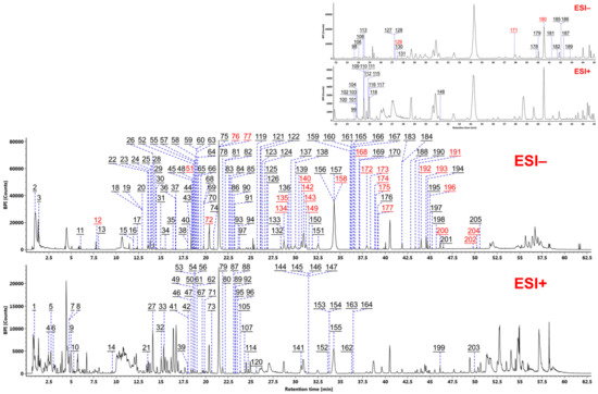 Base peak intensity (BPI) chromatograms of WXG in both positive and negative ESI modes. The peaks characterized with the aid of reference compounds are annotated in red. Peaks 98–104, 106, 108–112, 115–118, 127–131, 148, 171, 178–182, 185–187, and 189 are marked separately in the upper right corner for better observation.