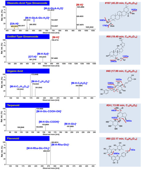 - Zhang, C.X.; Wang, X.Y.; Lin, Z.Z.; Wang, H.D.; Qian, Y.X.; Li, W.W.; Yang, W.Z.; Guo, D.A. Highly selective monitoring of in-source fragmentation sapogenin product ions in positive mode enabling group-target ginsenosides profiling and simultaneous identification of seven Panax herbal medicines. J. Chromatogr. A 2020, 1618, 460850. [Google Scholar] [CrossRef]
