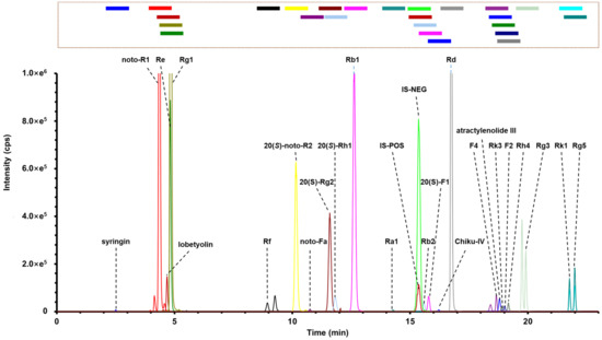 To evaluate the quality of multibatch commercial WXG samples, a UHPLC-sMRM approach was established and validated. A total of 24 compounds, including three from CP (lobetyolin, syringin, and atractylenolide III), and 21 from PN (noto-R1, noto-R2, noto-Fa, Re, Rg1, Rf, Rg2, Rh1, Rb1, Ra1, Rb2, F1, chikusetsusaponin IV, Rd, F4, Rk3, F2, Rh4, Rg3, Rk1, and Rg5) were quantitatively assayed. Lobetyolin, syringin, and atractylenolide III were mainly used for the quality evaluation of CP [46,47]. Oxidative stress and inflammatory reactions are closely related to cardiovascular and cerebrovascular diseases. Panax notoginseng saponins (PNS) were the main active ingredients of PN, which could play an important role in ameliorating inflammation, attenuating oxidative damage, and promoting angiogenesis in a myocardial ischemia model [48,49,50].