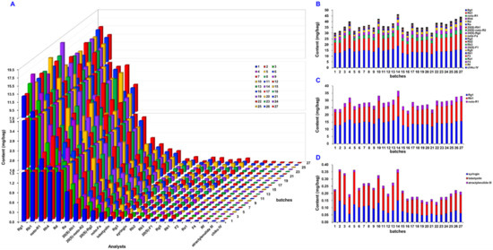 Content determination histograms of 24 compounds in 27 batches of commercial WXG samples: (A) the contents of all 24 compounds; (B) the contents of ginsenosides; (C) the contents of three ginsenoside markers recorded by the Chinese Pharmacopoeia; (D) the contents of three compounds originating from CP (Codonopsis pilosula).