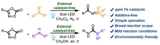 Nitrene intermediates have attracted great interest from chemists, due to their high reactivity [28,29,30,31,32,33,34,35,36]. Nitrene-based transformations allow the direct installation of nitrogen-containing building blocks into molecular backbones to build structurally complex compounds [37,38,39,40]. In the past few decades, a series of nitrene precursors were reported, such as organic azides [41,42], iminoiodinanes [43,44], amide N-O compounds [45,46], dioxazolones [47,48,49,50], and so on. Among them, dioxazolones are highly attractive because of their high activity, stability, convenience, and high coordination ability [51,52,53]. Herein, we present a visible-light-induced strategy to build N=P and N–C bonds for the generation of phosphinimidic amides and ureas from the reaction of dioxazolones and triarylphosphines or secondary amines (Scheme 1). The transformations are realized without any other catalyst or additive at room temperature. The ppm Fe in the reactants, confirmed by ICP-MS, might play an important role in this reaction.