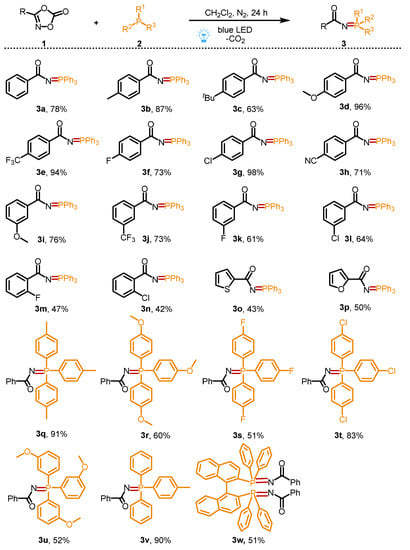 We commenced our study with the model reaction between 3-phenyl-1,4,2-dioxazol-5-one (1a) and triphenylphosphine (2a) under visible light and N2 atmosphere. The results are shown in Table 1. Initially, the reaction was carried out by employing DCE as the solvent under irradiation of 10 W 430 nm blue LED at room temperature, and the desired product N-(triphenyl-λ5-phosphinylidene)benzamide (3a) could be detected in 11% yield (entry 1). Afterwards, the solvent effect on the yield was investigated (entries 2–8). Different solvents, such as 1,4-dioxane, CH3OH, acetone, CH3CN, DMF, THF, and CH2Cl2, were surveyed, and the reaction exhibited excellent reaction performance in CH2Cl2 to provide the target product in 81% yield (entry 8). Further examination of the wavelengths of LED and substrate ratios showed no more positive results (entries 9–14). Control reactions confirmed that nearly no amidation product 3a was detected at room temperature in the absence of visible light (entry 15). Moreover, when the reaction was carried out in the air, only a trace amount of the product 3a was detected (entry 16). Therefore, the optimized reaction conditions were illustrated as follows: 1a (0.1 mmol); 2a (0.1 mmol); and CH2Cl2 (1 mL) in a N2 atmosphere under the irradiation of 430 nm blue LED (10 W) for 24 h at room temperature (entry 8).