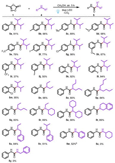 Then, we expanded the photocatalytic decarboxylation reaction of dioxazolones to the synthesis of unsymmetrical urea compounds (Scheme 3). To our delight, a wide range of 3-phenyl dioxazolones all reacted efficiently with diisopropylamine 4a to furnish the corresponding aryl ureas (5a–5m) in moderate to excellent yields (37–98%). In these cases, 3-phenyl dioxazolones bearing electron-donating groups (-CH3, -tBu, and -OCH3) showed a better reaction efficiency than those of 3-phenyl dioxazolones bearing electron-withdrawing groups (-CF3, -F, -Cl). Moreover, the broad scope of the commercially available secondary amines all reacted smoothly in this transformation, adding to the formation of desired ureas (5n–5v) in good to excellent yields (80–96%). In addition, the primary amine, such as aniline, was also a suitable substrate for reaction with 1a, providing the corresponding product 5w in 52% yield. However, cyclohexylamine (4l) and benzylamine (4m) were not suitable in this transformation to react with 1a to access the corresponding products 5x and 5y. Compared with the previous report [32], our method effectively avoids the harsh conditions of high temperature, showing good sustainability.