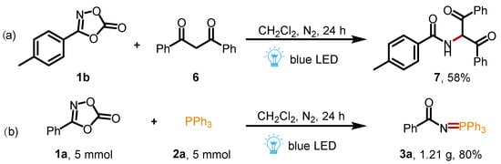 To our satisfaction, this method is also suitable for the reaction between 3-(p-tolyl)-1,4,2-dioxazol-5-one 1b and 1,3-diphenylpropane-1,3-dione 6 to give the corresponding amide product in 58% yield (Scheme 4a), which was previously reported in the presence of additional FeCl3 catalyst [29]. To verify the practicability of this synthetic protocol, the gram-scale synthesis of 3a was carried out (for details, see the Supplementary Materials). When the reaction was performed at a 5 mmol scale, the desired product 3a was isolated in 80% yield, indicating that this approach has a good practicability and application prospect (Scheme 4b).