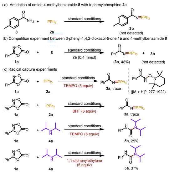 To understand the mechanism of this transformation, a set of control experiments were performed (Scheme 5). The phosphorylation of 4-methylbenzamide 8 with triphenylphosphine 2a was performed to determine whether the N=P bond was formed through the amide intermediate. However, 4-methyl-N-(triphenyl-λ5-phosphaneylidene) benzamide 3b was not detected (Scheme 5a). Moreover, intermolecular competition experiments of 1a and 8 were conducted, and only product 3a was obtained with 48% yield (Scheme 5b). These results demonstrated that the phosphorylation of dioxazolones was not conducted through amide intermediates. Furthermore, various radical trapping experiments were conducted (Scheme 5c). When (2,2,6,6-tetramethylpiperidine-1-yl)oxidanyl (TEMPO) was added to the model reaction under standard conditions, the reaction was significantly inhibited. The TEMPO-trapped acyl nitrene adducts were detected by high-resolution mass spectrometry (HRMS), with peaks at 277.1922 m/z. Subsequently, when another radical scavenger, 2,6-di-tert-butyl-4-methylphenol (BHT), was subjected under standard conditions, the reaction was also severely suppressed, indicating a radical process in the phosphorylation of dioxazolone with triphenylphosphine. Then, the radical trapping experiments of 1a and 4a were conducted (Scheme 5c). The decreased yields of product 5a indicated that the transformation also involved a radical process.