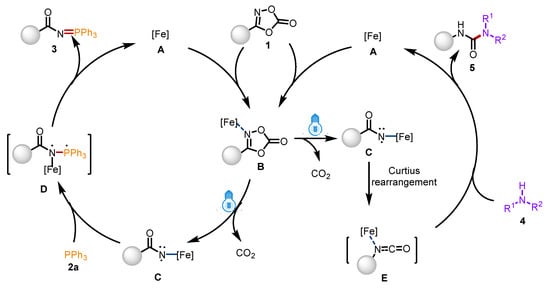Based on these control experiments and previous literature reports, a plausible reaction pathway is proposed in Scheme 6. Initially, the N atom of dioxazolones 1 coordinates with the Fe center to form complex B, which is excited by visible light to generate the highly active iron-aminyl radical C with the release of CO2. Subsequently, radical C reacts with triphenylphosphine 2a to form the complex D, followed by a reduction and elimination process to obtain product 3. On the other hand, intermediate C underwent Curtius rearrangement to form intermediate E, which further reacts with secondary amines 4 to obtain product 5.