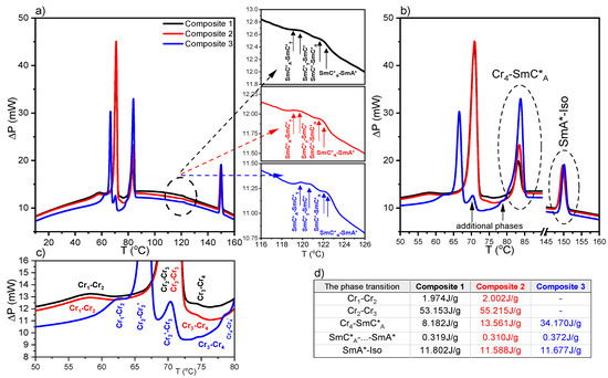 Calorimetric curves registered during heating for Composites 1–3 (a). Insets in (a) represent an enlarged temperature range of 116–126 °C for individual Composites. Enlarged temperature range of the DSC curves registered for Composites 1–3 with additional phase transition for Composite 3 marked by a vertical arrow (b), DSC curves at low temperature range (c), and table with the enthalpy changes for the chosen phase transitions (d).