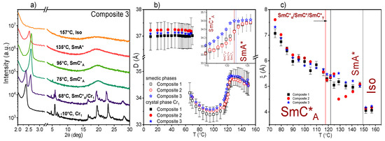 Representative diffraction patterns for the Composite 3 collected on cooling are shown in Figure 4a. The patterns of the SmA* and SmC*A phases are similar, therefore the sub-phases SmC*α, SmC*γ, and the SmC* phase existing in a narrow temperature range cannot be distinguished [61]. The hexatic SmI* phase of (S)-MHPOBC is not observed in diffraction results due to slow cooling [61]—crystallization starts before the SmC*A–SmI* phase transition is reached. The position of the low-angle peak at 2θ ≈ 2.6° is related to the smectic layer spacing (smectic layer thickness) D by the Bragg equation [62]. The temperature dependence of D is presented in Figure 4b. The layer thickness D is practically the same for all Composites 1–3 and equal to 34.5–34.8Å in the SmA* phase (increases slowly on cooling) while in the SmC*A phase, it decreases on cooling down to 33.4–33.6 Å at 95–100 °C, therefore the relative change of D in all smectic phases is ca. 4%. However, the increase of D on cooling below 95 °C (and decreasing of TLI signal at the same time) is an indicator of a subsequent hexatic phase, similarly to what was observed for other compounds [63,64]. Similar smectic layer spacing D was reported by Inui et al. for AFLC (TFMHPDOPB) while smaller (Dmax~31Å) for fluorinated orthoconic compound was reported by Milewska et al. [65,66]. Summarizing, both the transmitted light intensity and XRD methods confirm the existence of a hexatic phase below the anticlinic SmC*A one as was observed by the polarizing microscopy method.
