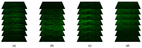 Fluorescence images in subsequent slices for the Au nanoparticles (at room temperature) (a), Composite 1 (b), Composite 2 (c), and Composite 3 (d) registered in the spectral ranges 490–590 nm. For Composites 1–3, the images were registered at 68 °C (SmC*A).