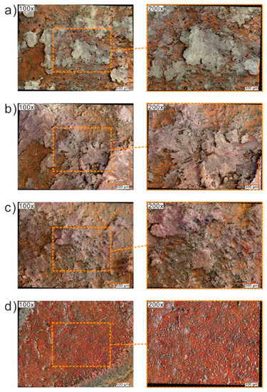 High-resolution digital optical images were registered for two different types of illumination (ring and coaxial) for Au nanoparticles and pristine Composites as well as Au nanoparticles and Composites cooled to room temperature after being heated to 155 °C and kept at this temperature for 5 min (Figure 7 and Figure 8 and Figure S8). The color of pristine Composite 1 was white while pristine Composites 2 and 3 were light pink, because the Au nanoparticles are pink (see Figure 7 and Figure 8). It is seen that the color intensity correlates with the increase in the concentration of Au nanoparticles—it is pinker for Composite 3 with a higher concentration of Au nanoparticles. For pristine Au nanoparticles at 50× and 100× magnification, the network of white lines on the pink area is visible (Figure 7, upper row). In our opinion, these lines are microscale cracks that resulted from the evaporation of the solvent during sample preparation. At 400× and 2000× magnification, chaotically arranged pillars with a length of less than 30 μm are visible in the sub-micro scale. What is interesting, after heating to 155 °C, annealing at this temperature for 5 min, and cooling down to room temperature the color changes to purple and microscale lines are also visible while the pillar’s structure is not (Figure 7, bottom row). In our opinion, the pillars visible at room temperature are Au nanoparticles which self-assemble through the chains of surfactant during isothermal evaporation of the solvent (toluene). In turn, heating to 155 °C causes the destruction of these structures due to thermal reorientation of the 1-octanethiol chains. The break of strong Au-S chemical bonds is also possible under the influence of temperature while the transition of surfactant is ruled out because the melting and boiling point of 1-octanethiol are −49 °C and 199 °C, respectively.
