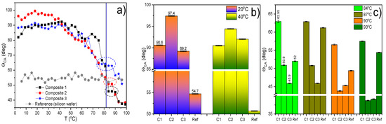 Temperature dependence of the contact angle for Composites 1–3 (C1, C2, and C3), and silicon wafer (Ref) during heating from 0 °C up to 100 °C (a). The dashed ellipses outline the step related to the Cr–SmC*A phase transition. Bar chart of contact angle in the crystal phase for two chosen temperatures (b) and in the SmC*A phase for the four chosen temperatures (c). Error bar is a sum of systematic uncertainty and standard deviation for left and right drop contact angles.