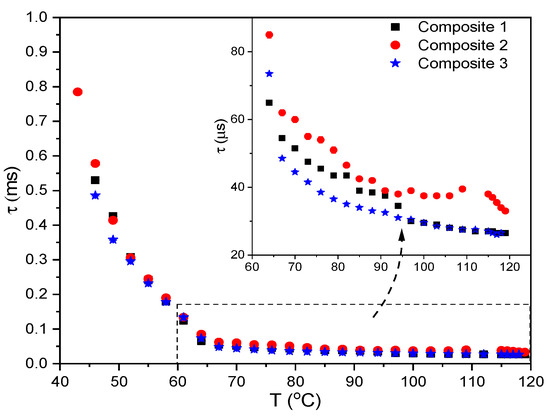 The effect of Au nanoparticles on the switching time was investigated in the broad temperature range (Figure 11 and Figure S12). In the SmC*A phase (down to ca. 65 °C) the switching time is shorter than 100 μs while below 65 °C its significant increase is visible for all Composites (which is caused by an increase in viscosity). Such behavior is typical for antiferroelectric liquid crystals [57,69]. In the SmC*A phase (up to 95 °C) the switching time is shorter for Composite 3 than for Composite 1 while the longest is for Composite 2 while above 95 °C it is the same for Composites 1 and 3 and ca. 10 μs shorter than for Composite 2. The shorter switching time for Composite 3 relative to Composite 1 may be due to the local field modification (increase) after doping [70]. In our opinion, a shorter switching time for Composite 3 relative to Composite 1 may be due to several reasons. A decrease in the material viscosity after doping, modification of the local field that acts on the molecules, the agglomeration process as well as interactions between LC molecules and Au nanoparticles should be considered [70]. In our case, a shorter switching time for Composite 3 relative to Composite 1 may be due to the local field modification (increase) after doping, as a dominant factor.