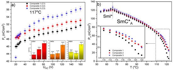 Spontaneous polarization versus applied voltage, T = 117 °C, f = 50 Hz (a). The inset shows the Ps bar graphs for the selected amplitudes at T = 105 °C, f = 50 Hz. Temperature dependence of the spontaneous polarization in the SmC*A and SmI* phases for all Composites (b). An enlarged high temperature range is presented in the inset, ΔUAC = ±2 V, ΔPs = 1%.