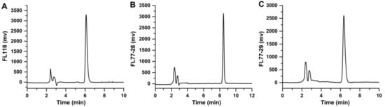 Representative chromatograph, FL118 with a retention time of 6.109 min (A), FL77-28 with a retention time of 8.456 min (B), and FL77-29 with a retention time of 6.351 min (C).