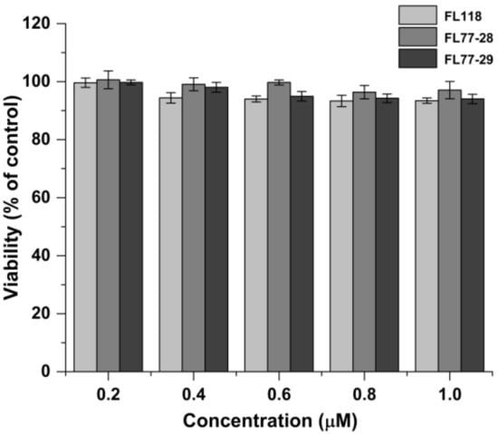 Cytotoxicity of FL118, FL77-28, and FL77-29 for 4 h on Caco-2 cells using MTT assay. Data represent the mean ± SD (n = 3).