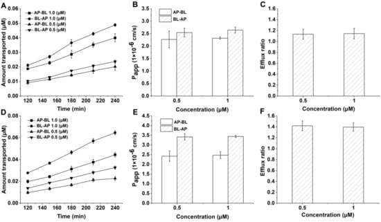 - Troutman, M.D.; Thakker, D.R. Efflux ratio cannot assess P-glycoprotein-mediated attenuation of absorptive transport: Asymmetric effect of P-glycoprotein on absorptive and secretory transport across Caco-2 cell monolayers. Pharm. Res. 2003, 20, 1200–1209. [Google Scholar] [CrossRef] [PubMed]