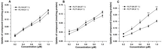 Effect of temperature on the uptake of FL118 (A), FL77-28 (B), and FL77-29 (C) at 4 °C or 37 °C for 4 h in Caco-2 cells. Results are the mean ± SD (n = 3). * indicated p < 0.05 and ** indicated p < 0.01, compared with the results at 4 °C.