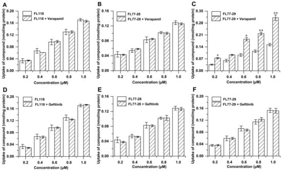 To determine whether P-gp and BCRP were responsible for the cellar uptake of FL118, FL77-28, and FL77-29, the Caco-2 cells were pretreated with Verapamil (P-gp inhibitor) or Gefitinib (BCRP inhibitor) for 30 min and then exposed to FL118, FL77-28, and FL77-29 (0.2, 0.4, 0.6, 0.8, and 1.0 μM) at 37 °C for 4 h. These results showed that the uptake of FL118 (Figure 5A,D) and FL77-28 (Figure 5B,E) was not significantly increased in response to Verapamil or Gefitinib, indicating that FL118 and FL77-28 were not substrates of P-gp or BCRP. Gefitinib did not significantly promote the uptake of FL77-29 (Figure 5F), indicating that FL77-29 was not a substrate for BCRP. However, the uptake of FL77-29 (Figure 5C) significantly increased with Verapamil compared to the group without Verapamil, showing that the uptake of FL77-29 was mediated by P-gp.