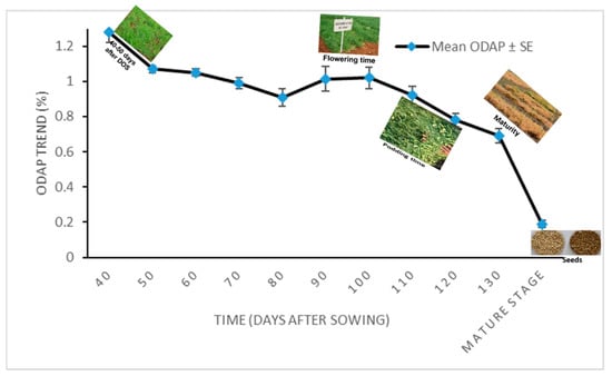4.2. Changes in the Concentration of Total ODAP in Different Parts of Plants Depending on the Developmental Stage