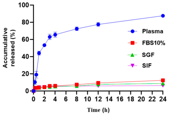 TP-CSO release profiles in mouse plasma, 10% FBS of cell culture medium, SGF (simulated gastric fluid, pH 1.2), and SIF (simulated intestinal fluid, pH 7.5) (n = 3).