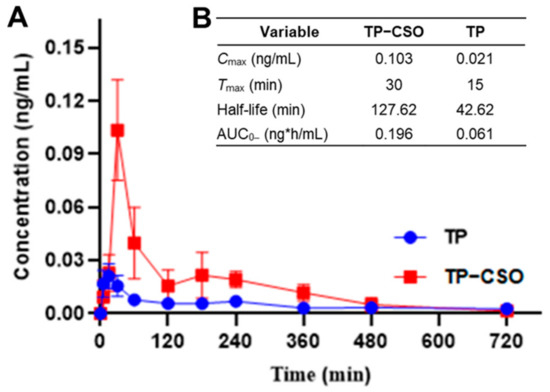 Plasma concentration of TP (A), pharmacokinetic parameters (B) after administration of TP and TP-CSO, respectively (n = 5).