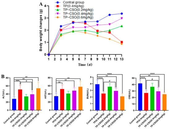 In vivo toxicity of TP and TP-CSO: body weight changes (A); biochemical parameters (B). ** Represents p < 0.01, *** represents p < 0.001, **** represents p < 0.0001, vs. control group; # represents p < 0.0001, TP-CSO (0.4 mg/kg) vs. TP group (0.4 mg/kg) (n = 6).
