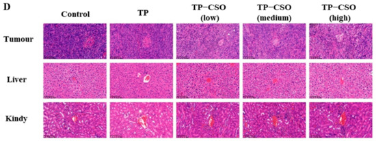 As shown in Figure 5D, the control group showed the obvious nuclear division, and negligible apoptosis levels were observed in the dense tumor cells, whereas the treated groups exhibited a large number of cell necrosis and apoptosis in the tumor tissues, indicating TP and TP-CSO have a significant inhibitory effect on tumor cells. In particular, the medium- and high-dose TP-CSO groups displayed a higher apoptosis rate and cell necrosis than the TP group, indicating that TP-CSO has better anti-tumor activity than TP. Analysis of histological staining revealed the obvious kidney proximal tubular dilation and fatty degeneration in the hepatocytes in the TP group (Figure 5D). However, no significant histopathological changes were observed in the TP-CSO groups, which was consistent with the in vivo toxicity results of TP-CSO.