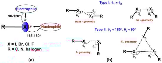 - Ramasubbu, N.; Parthasarathy, R.; Murray-Rust, P. Angular preferences of intermolecular forces around halogen centers: Preferred directions of approach of electrophiles and nucleophiles around carbon-halogen bond. J. Am. Chem. Soc. 1986, 108, 4308. [Google Scholar] [CrossRef]